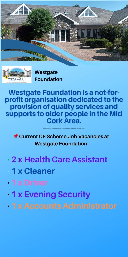 Westgate Foundation currently employs CE participants, all bringing a very positive contribution to the running of the organisation. The project is managed by the Community Employment Supervisor, Marguerite Hayes, and by the sponsorship management committee. Positions on the scheme include Healthcare Assistants, Catering Assistants, Drivers, Security Personnel, Maintenance & Gardening staff, Cleaning Operatives and Reception & Administration staff. All CE positions are for 19.5 hours per week and participants can take up other part-time work during their placement.